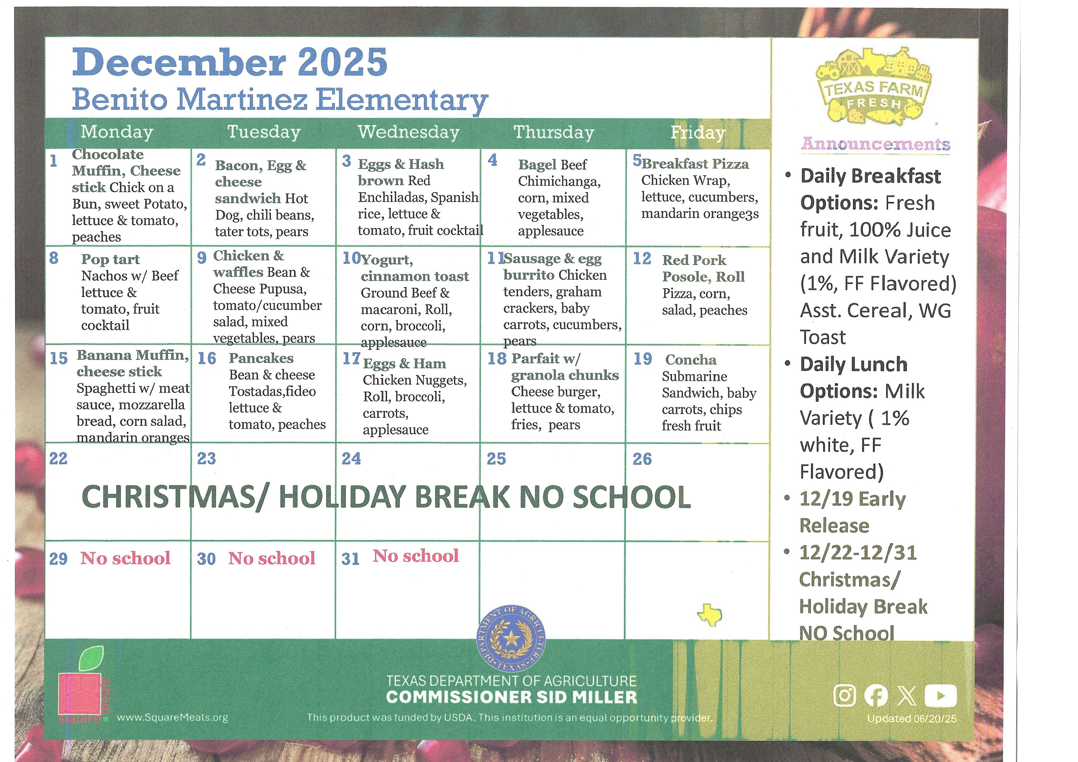 Benito Martinez Elementary December 2025 Menu