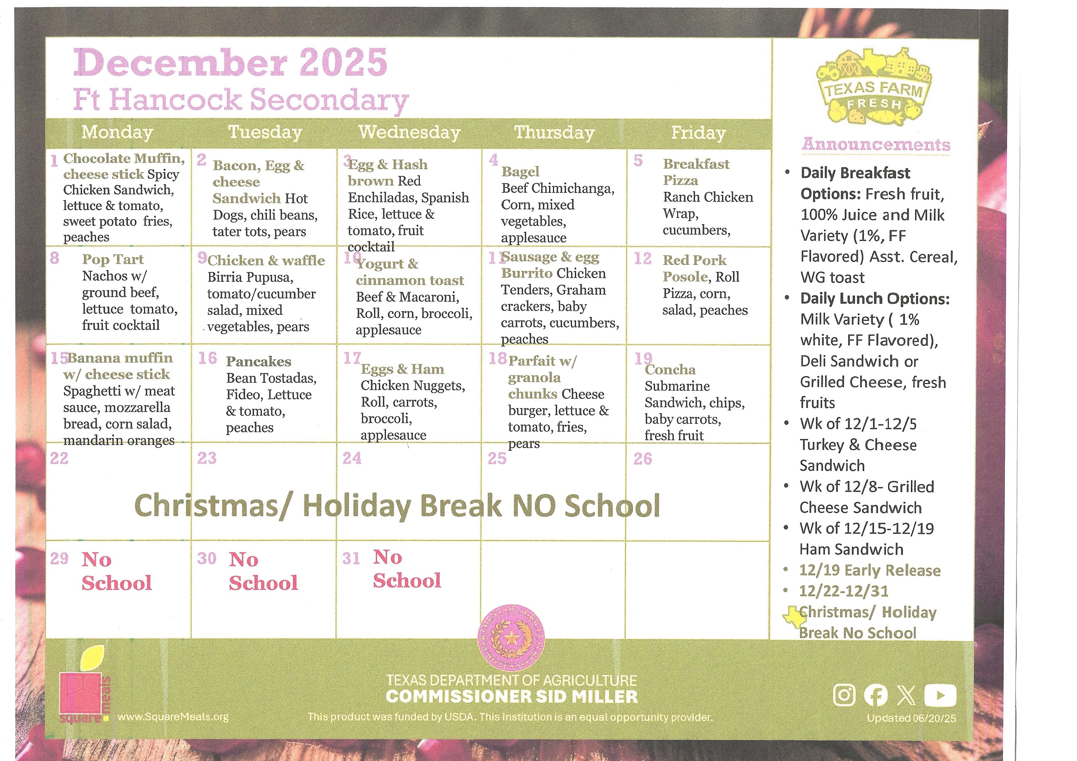 Fort Hancock Secondary December 2025 Menu